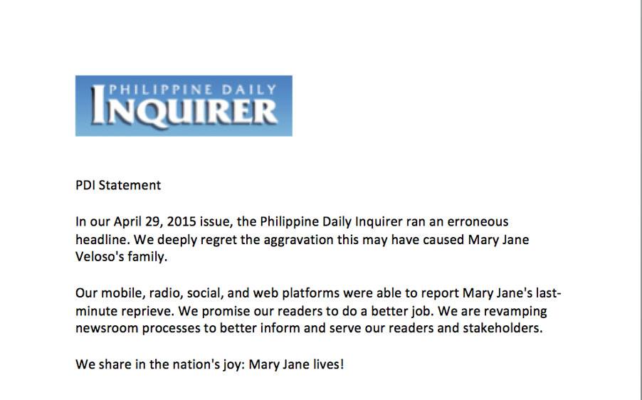 “In our April 29, 2015 issue, the Philippine Daily Inquirer ran an erroneous headline. We deeply regret the aggravation this may have caused Mary Jane Veloso’s family.”