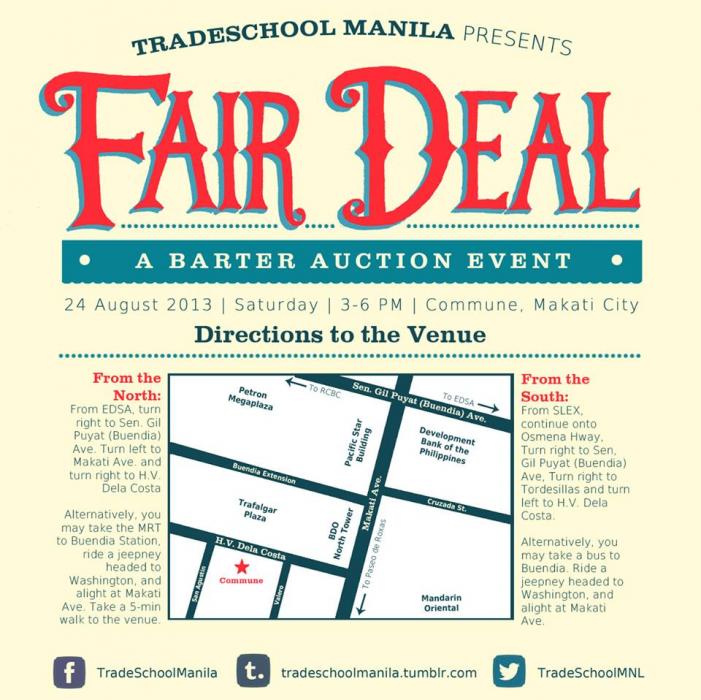 Meanwhile, if you are interested in trading what you have for what someone can offer, Trade School Manila’s Fair Deal barter auction happens from 3 to 6 PM at the Commune coffee shop in Salcedo Village, Makati.