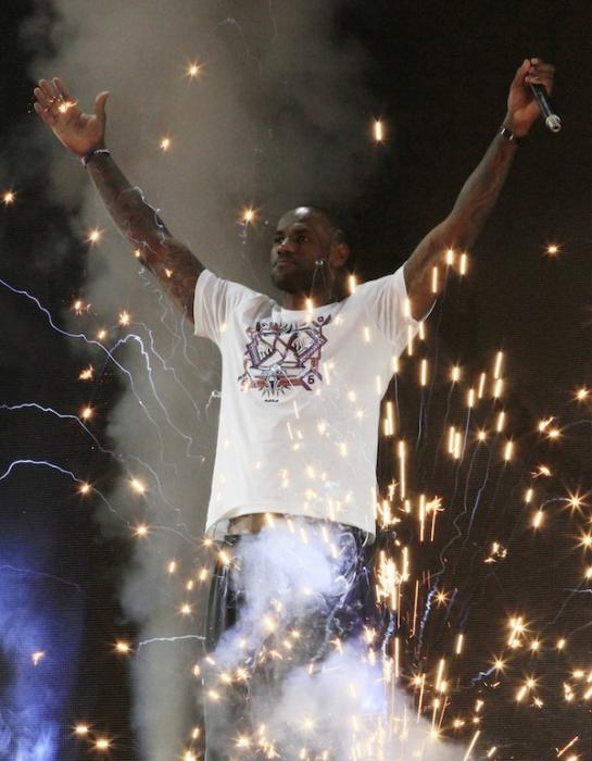 The #WitnessHistory basketball clinic held by LeBron James at the Malls of Asia Arena yesterday was jam packed with fans who greeted the Miami Heat forward like a God. James’ introduction was complete with a fireworks display and dance moves. LeBron threw and kicked autographed basketballs into the stands before performing drills.