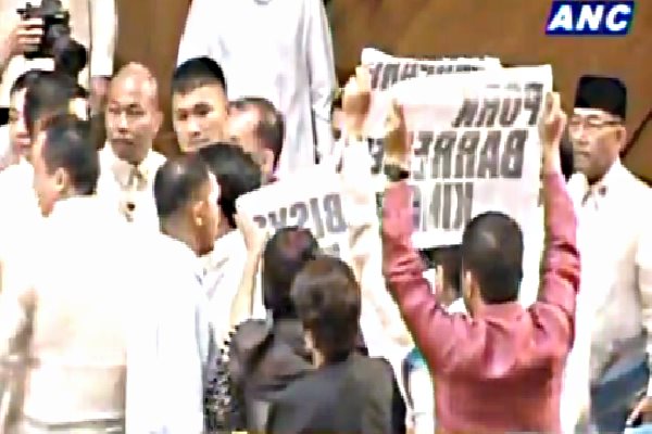 Towards the end of the speech, the left-wing lawmakers brought out posters critical of Aquino and called him a failure, to the catcalls of the Aquino-friendly gallery. “Boos” were also heard. Senator Franklin Drilon booed right back.