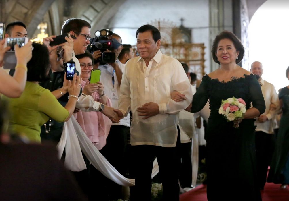 President Rodrigo Duterte greets newly-weds Waldo and Regine Carpio at San Agustin Church in Intramurous, Manila.