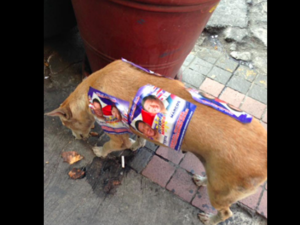 A photo that’s gone viral shows a streetdog near Robinson’s Manila in Ermita plastered with four campaign stickers on its body.