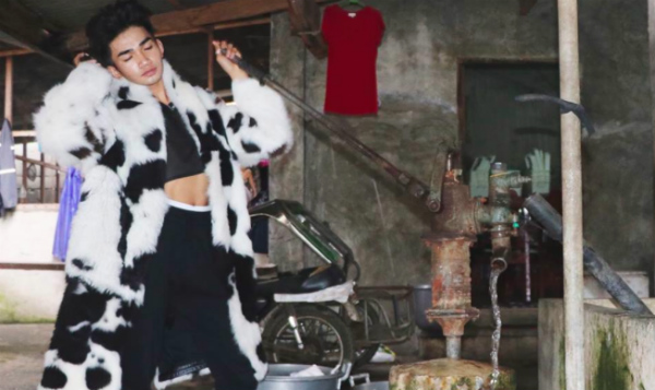 The 18-year-old sensation rode the tricycle, pumped water from the poso, and stirred food on a huge kawali — all while wearing a fashionable cow-print coat.