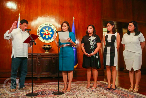 President Rodrigo Duterte officially swore in Vice President Leni Robredo as his Housing chief on Tue evening at Malacañan Palace.