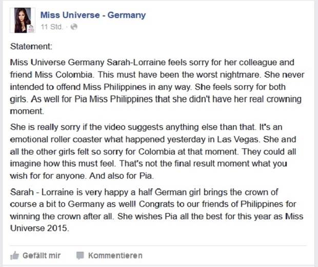 “Sarah Lorraine is very happy a half-German girl brings the crown of course a bit to Germany as well. Congrats to our friends of Philippines for winning the crown after all. She wishes Pia all the best for this year as Miss Universe 2015,” her statement ends.