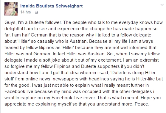 Then she addressed her reference to Adolf Hitler, saying, “I am half-German that is the reason why I talked to a fellow delegate about ‘Hitler’ so casually [because she is] Austrian. Because all my life I am always teased by fellow filipinos as ‘Hitler’ because they are not well informed that Hitler was not German. In fact, Hitler was Austrian. So , when I saw my fellow delegate I made a soft joke about it out of my excitement.”