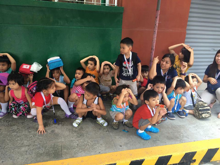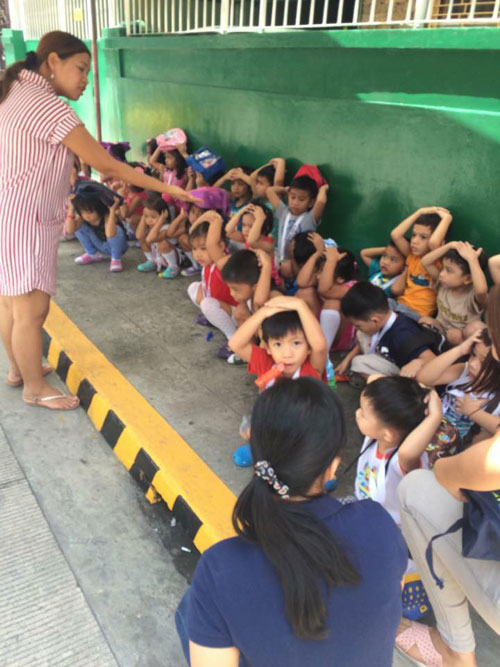 Kids of Global Academy doing the drop and cover. Photo contributed by Armela Arbitria.