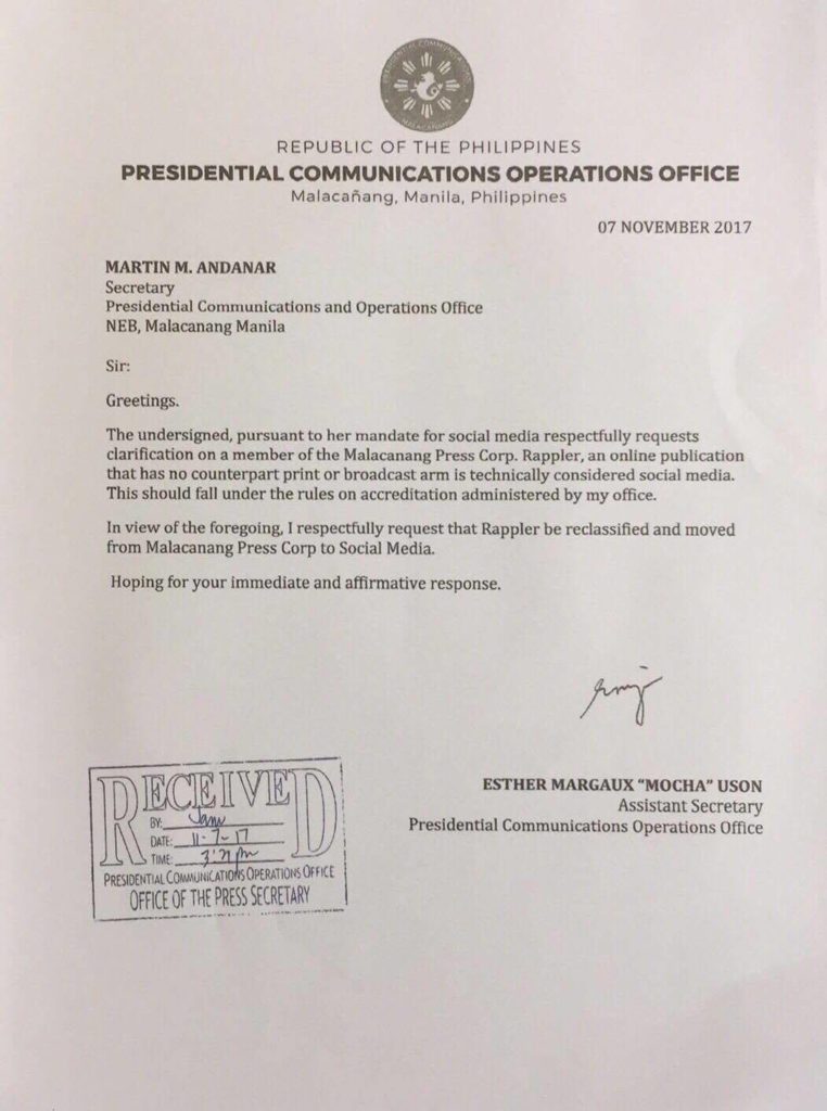“In view of the foregoing, I respectfully request that Rappler be reclassified and moved from Malacañang Press Corp. (sic) to Social Media,” Uson said in her letter to Andanar.