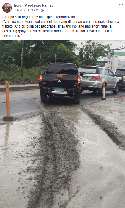 Facebook user Edjun Magdayao Ramas shared a photo on Friday of a pickup truck that drove through wet cement just to get through traffic. While this may have made his trip a few minutes shorter, the driver’s move has also caused a stir with a number of annoyed netizens.