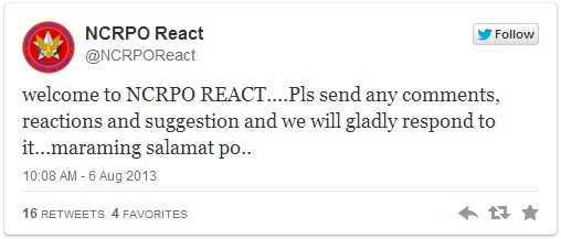 The National Capital Region Police Office (NCRPO) has launched its Facebook and Twitter accounts for faster and easier interaction with netizens. Dubbed as “NCRPO React”, the twitter and facebook accounts are aimed at real-time interaction between the metro police force and the general public.
