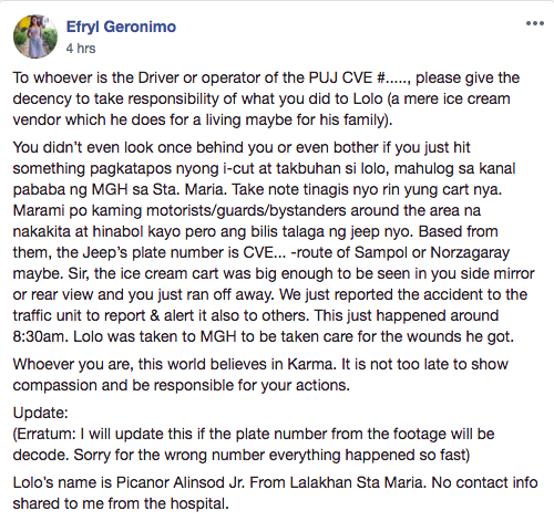 “To whoever is the driver or operator of the PUJ [public utility jeepney] CVE #….., please give [sic] the decency to take responsibility of (sic) what you did to Lolo (grandfather),” she wrote. According to Geronimo, the alleged incident happened at 8:30 am.