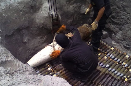According to a DZMM report, a backhoe uncovered the “105 mm projectile bomb” at the construction site of Fisher Mall on the corner of Quezon and Roosevelt avenues in Quezon City.