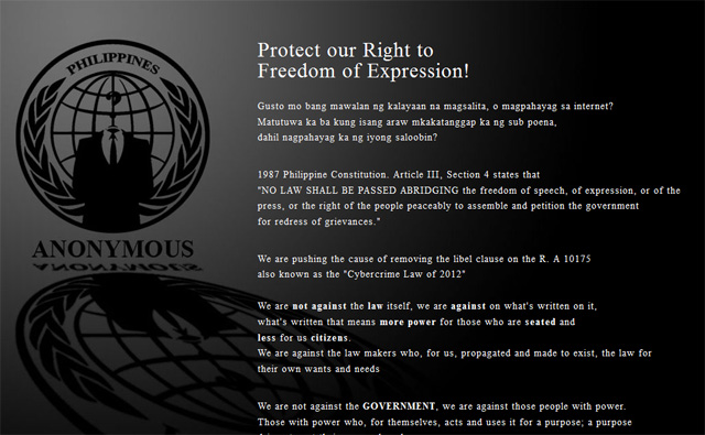 Collectively known as Anonymous Philippines, they “defaced the online presence of local government units,” according to Philstar.com. This they did by putting a black screen, a logo and a message about the right to freedom of expression.