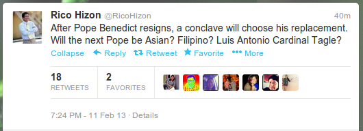 Rico Hizon was more forward looking with his tweet: “After Pope Benedict resigns, a conclave will choose his replacement. Will the next Pope be Asian? Filipino? Luis Antonio Cardinal Tagle?