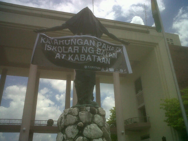Kabataan party-list, whose members picketed outside the administration building, said in a press statement that Oblation statues in UP campuses across the country “to symbolize the ‘death of affordable and accessible education’ in the country.”