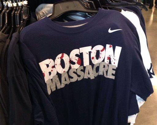 According to a Manila Bulletin report, the shirt, which features blood spatter on the word “BOSTON” originally targeted New York Yankees fans. The Boston Massacre was a term coined in the 1978 Worlds Series baseball championships where the Yankees mercilessly beat their opponents, the Boston Red Sox.