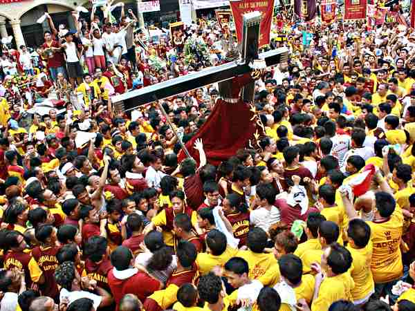 The procession of the Black Nazarene, or Traslacion, is an annual event that happens every Jan. 9. A life-sized statue of a dark-skinned Jesus Christ carrying a cross is paraded on the streets of Manila with as much as 1.5 million devotees following the carriage. Many Filipinos believe the statue is miraculous and answers prayers or cure diseases when one touches it.