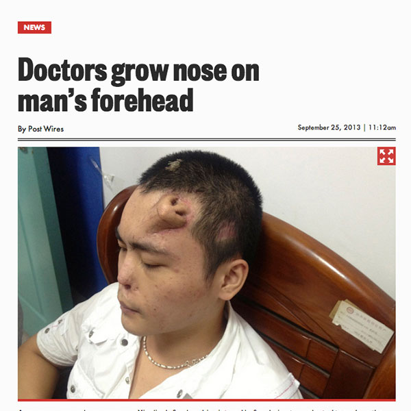 We normally take tabloiod reports with a grain of salt – and that’s what we hoped to do when we read New York Post’s headline ‘Doctors grow nose on man’s forehead’. Then when we saw the Reuters photo credit, and we had to step back, rub our nose and ask ourselves, could this be true?
