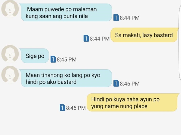 The driver texted this response, “[Ma’am], tinatong ko lang po kayo. Hindi po ako bastard (Ma’am, I just asked you a question. I am not a bastard).”