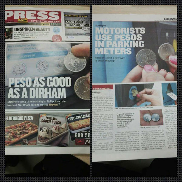 We’re old enough to remember using public pay phones in Manila when it cost PHP.40 to make a single, no time limit call. And we’re street-smart enough to have learned how to make calls with only two PHP.10 coins: by dropping them together as fast as you can, you could trick the phone into thinking that you fed it four coins. Fast-forward 30 years later and we’re happy to report that our local coins are still being used to cheat the system. A reader of the weekly tabloid XPRESS Abu Dhabi sent us this report about motorists there using one peso coins, which is almost the same size and weight as the one dirham coin, to cheat parking meters and saving a lot of money in the process. One dirham costs PHP12; parking in Abu Dhabi costs between DH2 and DH3 an hour.