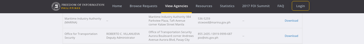 Twitter user @peepaubau shared a series of screenshots of the government website which showed agencies Maritime Industry Authority (MARINA) and the Office for Transportation Security with their local directory numbers listed as “Di ko alam,” which is Filipino for “I don’t know.”