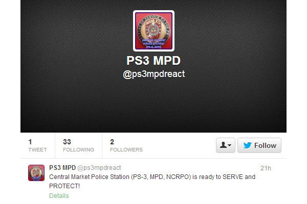 The Central Market Police Station (Police Station 3) of Manila Police District has its own account, announcing it is “ready to SERVE and PROTECT!” MPD Police Station 3 (@ps3mpdreact) is attached to the National Capital Region Police Office, which also has a Twitter account.
