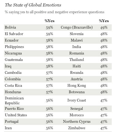 Gallup surveyed 148 countries in 2014, asking people if they experienced any of five positive and five negative emotions. The ranking is based on the average number of ‘yes’ responses.