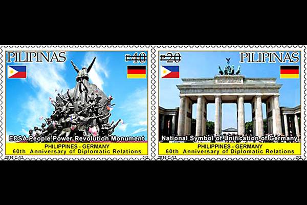 The stamps feature the People Power Monument on EDSA and the Brandenburg Gate in Berlin. The 40mm x 30 mm stamps will be sold starting starting June 25 the for PHP20 and PHP40.