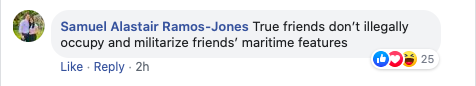 Samuel Ramos-Jones wrote on the Chinese Embassy’s official Facebook page: “True friends don’t illegally occupy and militarize friends’ maritime features.”