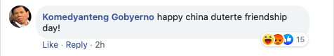 Someone called Komedyanteng Gobyerno (Comedian Government) snarkily wrote, “Happy China Duterte friendship day!”