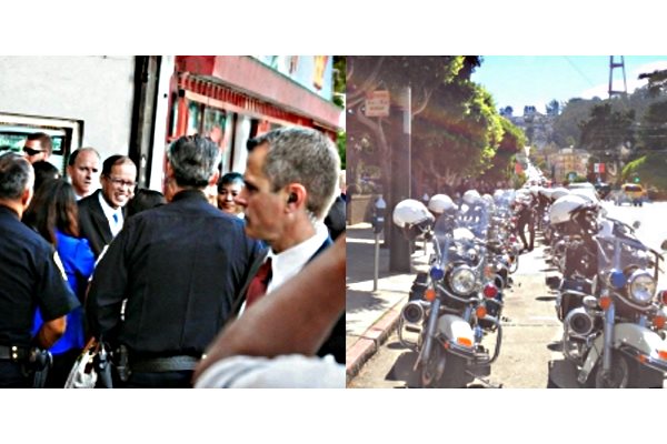 Hoodline.com then revealed that a local resident Jerry Gainor caught some more photos of Aquino’s visit, which, as the report put it, “show an intimidating array of SFPD motorcycles as well as a smiley President Aquino greeting his admirers.”