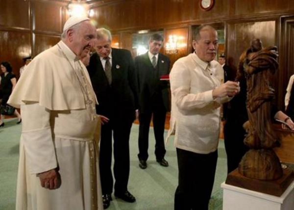 Photo: Malacanang Photo Bureau (Pope and PNoy with sculpture) and Fred Baldemor (via ANC)