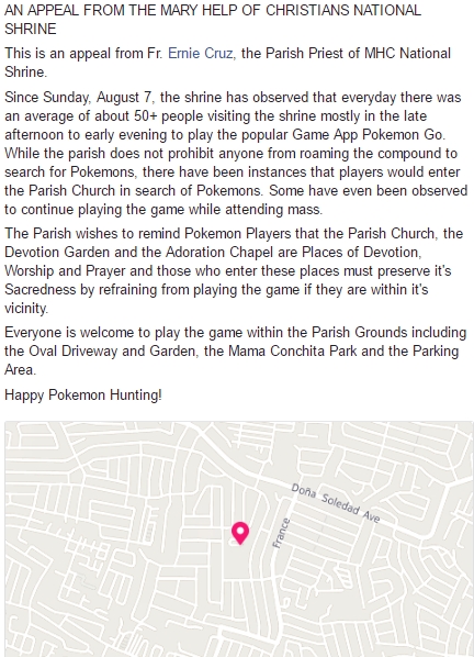 However, the annoucement also added, “Everyone is welcome to play the game within the parish grounds including the oval driveway and garden, the Mama Conchita Park, and the parking area.” The announcement even ended with this cheer-of-sorts: “Happy Pokemon-hunting!”