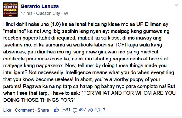 The article went on to cite some faculty members who revealed that grade inflation was a complex matter. It is this matter that, most likely, prompted a UP professor named Gerardo Lanuza to write a Facebook post, which was made available to the public, pertaining to the matter: