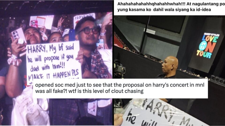 Remember when Harry Styles helped a couple get engaged during his Love on Tour Manila concert last week after performing a duet with the woman’s boyfriend? Turns out, it was staged — not by Harry, but apparently by the woman who held up the sign.