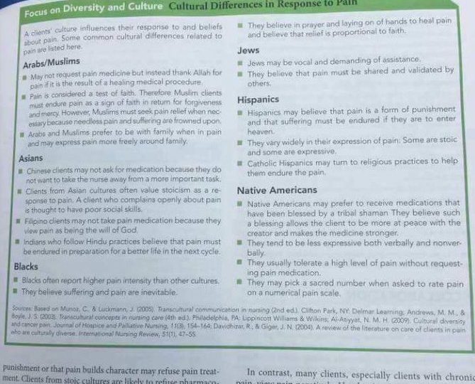 It also says “Filipino clients may not take pain medication because they view pain as being the will of God” and “Chinese clients may not ask for medication because they do not want to take the nurse away from a more important task.”