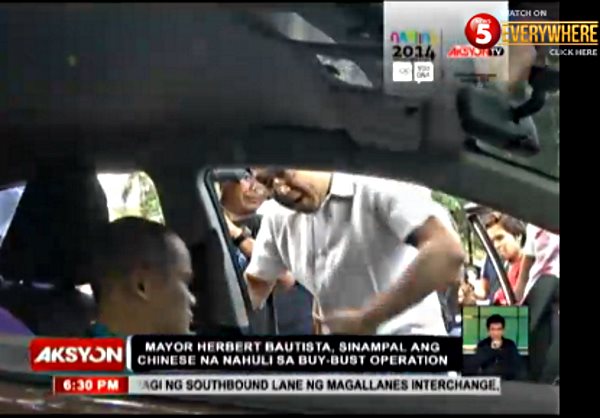 “Unable to contain his anger, Quezon City Mayor Herbert Bautista on Friday, August 8, slapped a Chinese drug dealer after the suspect refused to answer questions after his arrest during a buy-bust operation,” reports News5.