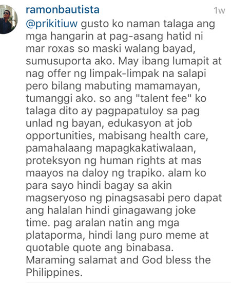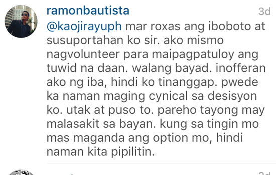 He reiterated his support for Roxas on both Instagram and Twitter. “Mar Roxas ang iboboto at susuportahan ko sir,” he told a commenter.