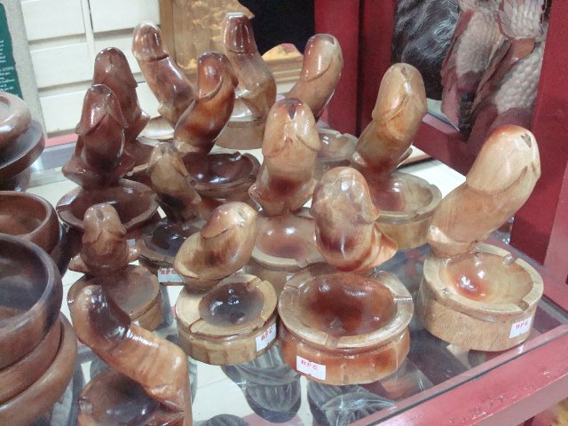 Another attention-grabbing wooden creation that will stop you on your tracks when you’re at the Filipiniana section of the mall is the penis ashtray. It is available in all sorts of sizes (extra small, small, medium, large, extra large, extra extra large) and shapes (we assume each one is individually carved by hand). One thing we noticed, however: all of them are circumcised.