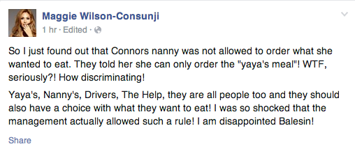 Which is true. As Coconuts Manila originally reported, the ‘yaya meal’ is only an option for guests who would rather not pay the full meal price. “We treat yayas as our guests,” A certain Jason of Balesin reception told us when we called them to clarify.