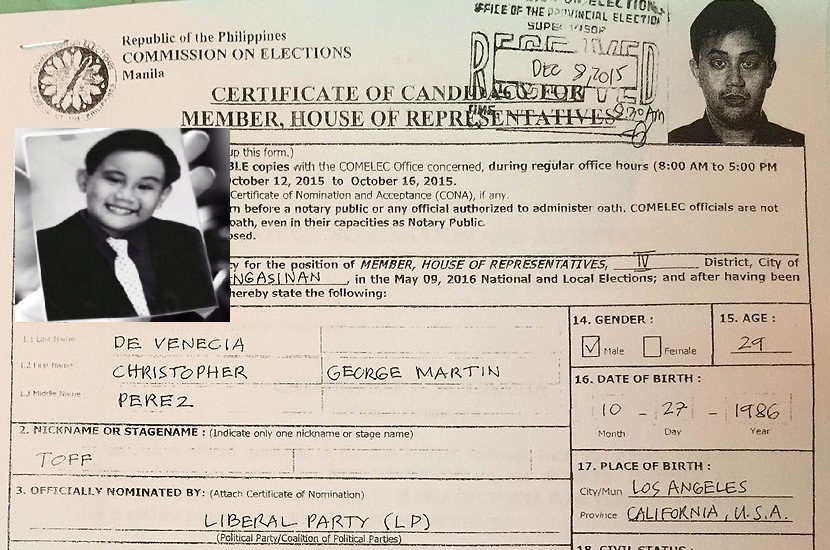 Aside from the COC and Certificate of Nomination and Acceptance, the younger De Venecia, who was born in Los Angeles, California, also submitted to Comelec Pangasinan an affidavit of renunciation of American citizenship and allegiance to the United States of America.