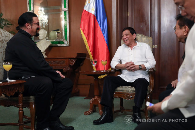 In what could have been a scene from his next straight-to-DVD classic, Steven Seagal — Hollywood actor, Vladimir Putin buddy and sometimes blues singer — dropped by the Palace yesterday for a late-night bull session with President Rodrigo Duterte.