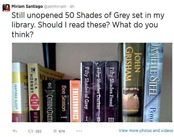 On Friday, she asked her Twitter followers: “Still unopened 50 Shades of Grey set in my library. Should I read these? What do you think?”