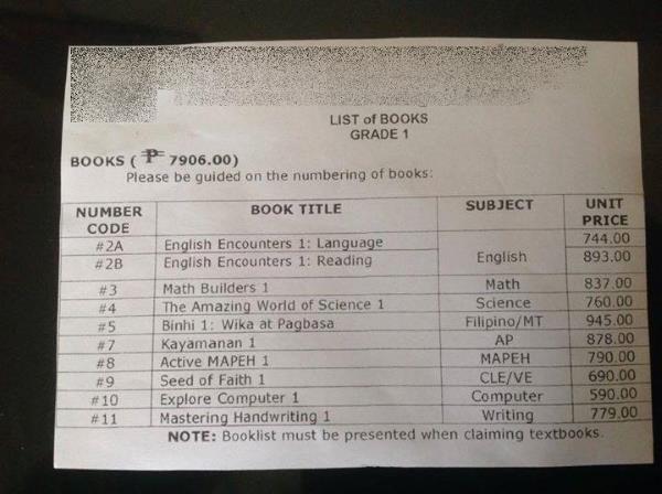 A list of textbooks required for Grade I pupils at a private school in Antipolo, Rizal, has been making the rounds in social media.