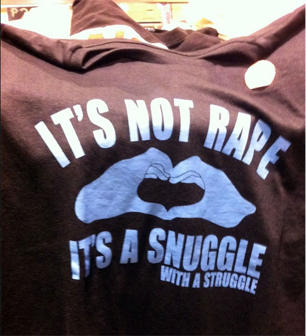 The shirt that was posted on Facebook is NOT part of the BNO Tees collection. Rape is a very serious matter. We are against it. No means no.