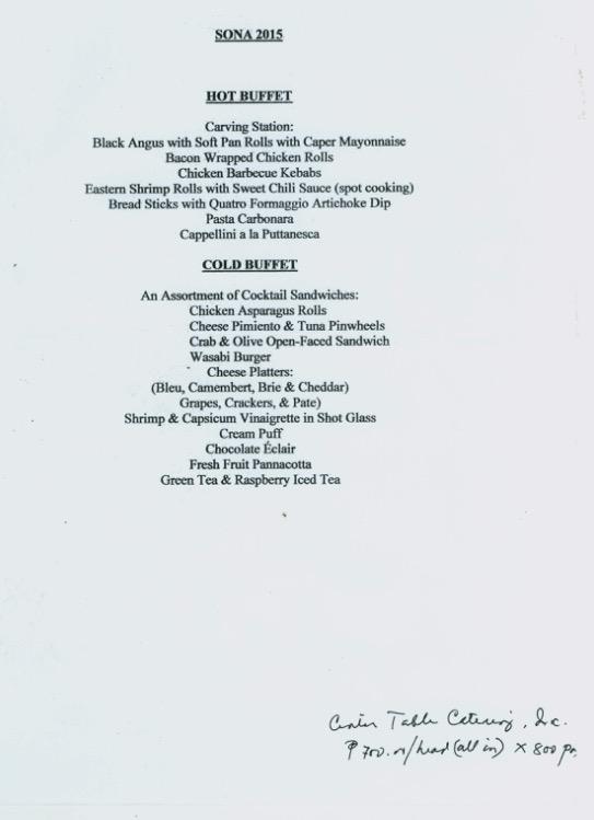 An image of the SONA 2015 menu was shared by GMA News reporter Tina Panganiban-Perez (see below) via Twitter. A handwritten “note” on the sheet of paper shows that the food cost was computed at PHP700 per head, a fact which has already drawn mixed reactions from the public.