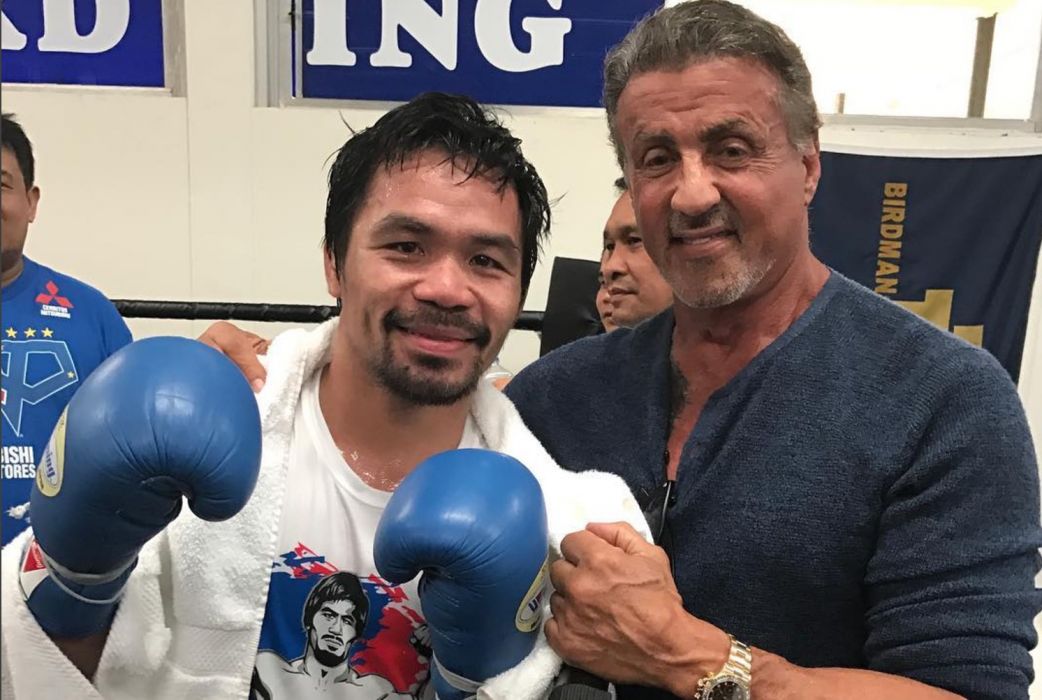 Hollywood star Sylvester Stallone visited Pacquiao to watch him spar six rounds with Rey Beltran.