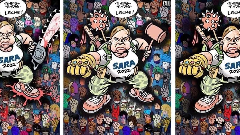 Late last night, Pabalinas posted his own take(down) on the #Tumindig trend, with an illustration of a scowling woman (presumably Sara Duterte) wearing a Sara 2022 shirt and camouflage-patterned pants. On the left hand, she is carrying Mjolnir, while the right hand wears Thanos’ Infinity Gauntlet. She says, “Tindig-tindig. Leche!”