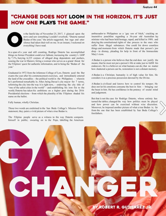 One of the pieces in the issue, titled Game Changer, criticized Duterte for not living up to the school’s values saying:
