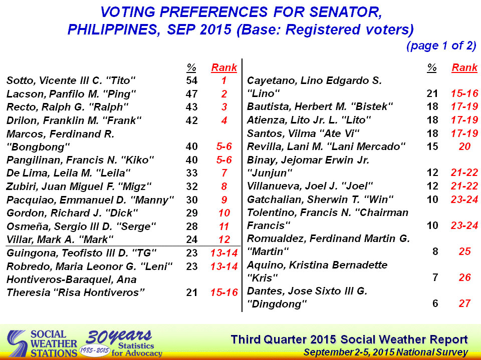 The latest Social Weather Stations (SWS) survey said that — according to 1,200 respondents — the top choice for the Senate race in 2016 is Senator Tito Sotto.